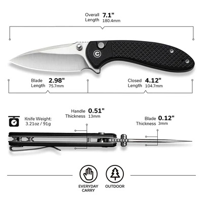 The CIVIVI Faeger C24031-1 is a modern, performance-driven everyday carry knife that blends effortless operation with premium materials. Featuring a 2.98″ satin-finished 14C28N blade, this knife delivers strong edge retention, corrosion resistance and consistently smooth slicing. Its milled Black G10 handle offers lightweight durability and improved grip texture, while the dual-deployment system—flipper tab and thumb stud—allows fast, intuitive opening from any angle. The reliable button lock ensures safe, secure use, making the Faeger a streamlined and dependable option for daily carry.