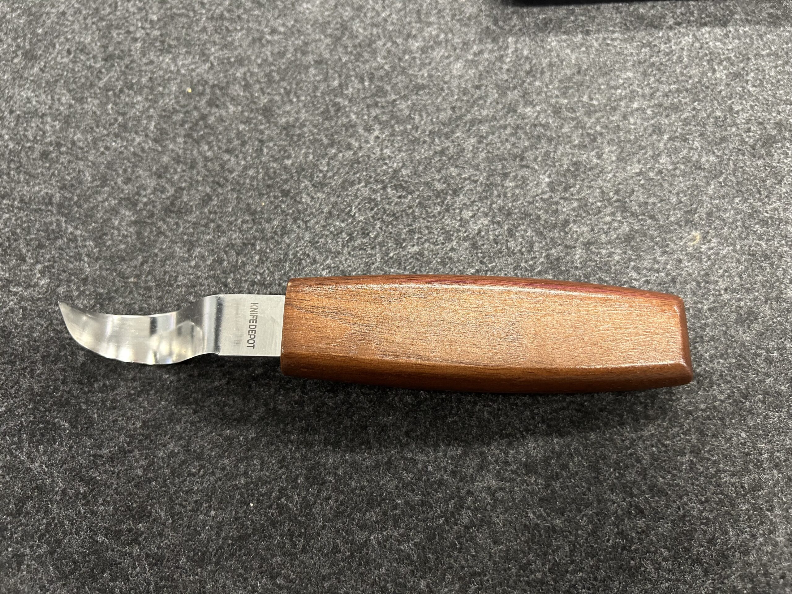 The hook knife (spoon carving tool) is for carving spoons, bowls, and round, deep holes in wood for other crafts. It is essential for cutting holes in wood surfaces. Due to the curved (semicircular) shape, such a knife is very effective for various woodworking tasks, namely figured woodcarving. The user can refine the form of a cup, spoon, bowl, and other products with a similar design. Such a tool will become indispensable not only for carving spoons from wood but also for performing various other techniques in the art of wood carving related to cutting grooves in the wood. It suits right-handed users.